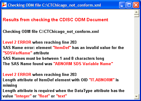 This demo shows what happens if an ODM file is checked which is even not valid XML. However, the file also contains some other non-conformities.