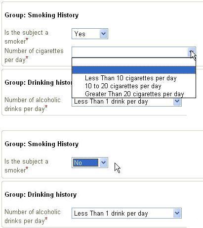 These ODM conditions are transformed into XForms conditions automatically with our technology. This causes e.g. all the questions about smoking habits to disappear from the screen