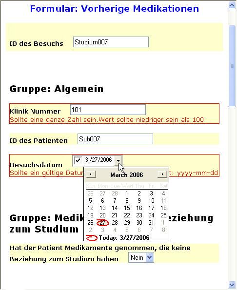 The same is true for the "Protocol Number" field (remark that we changed the definition in the ODM to demonstrate this): in the ODM it is defined that the Protocol Number should be an integer. This information is passed to the XForm, and if the user tries to fill something else than an integer into the corresponding field of the XForm, the field is highlighted.