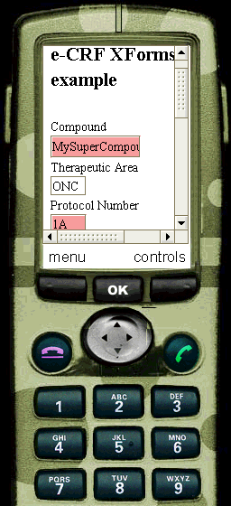 The eCRF in XForms format can be send to a device with or without extra presentation items (in our example we added a tiny amount of XHTML to have it a better look in your browser). Adding presentation can again be done using stylesheets. In smaller devices (like PDAs and cell phones), adding presentation will usually not be necessary, as the device itself takes care of that.