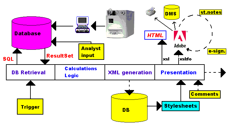 If the company now decides to give the Analysis Certificate another design (e.g. because the company name changed), all that has to be changed is the stylesheet. It is not necessary to change anything in the application (which would mean an expensive re-validation !).